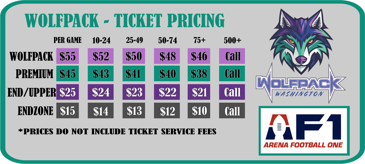 You will be hard-pressed to find a better value in sports than the Washington Wolfpack Arena Football team. Heading into the 2026 AF1 season, we are excited to announce the following ticket pricing. All pricing is per game for the 2026 Season and does not include ticket service fees.